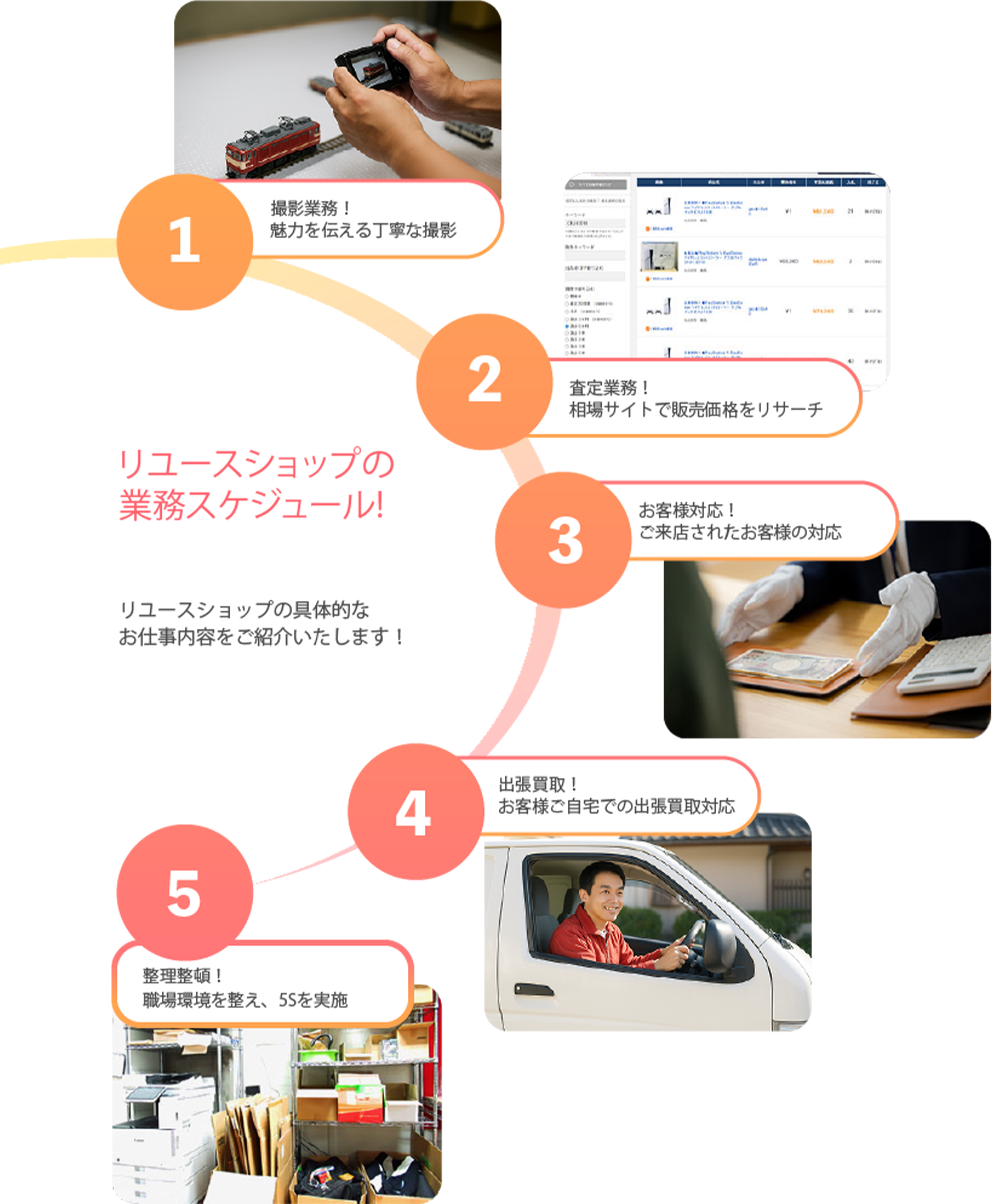 お願いしたいお仕事は、商品の査定やお客様対応、写真撮影、パソコンでの出品作業をお任せします。